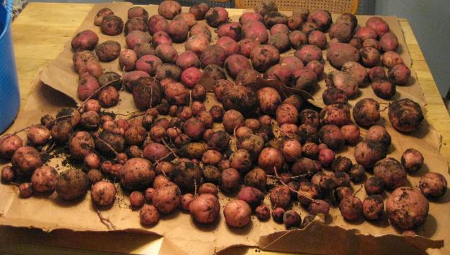 Some were an early season, some were a mid-season, and some just didn't look healthy enough to finish out the season. We don't have a great way to weigh them but we brought in just over 7 gallons ranging in size from about as big as my fist to about as small as a pea. We damaged the skin on some of them so we'll be eating those over the next couple weeks.